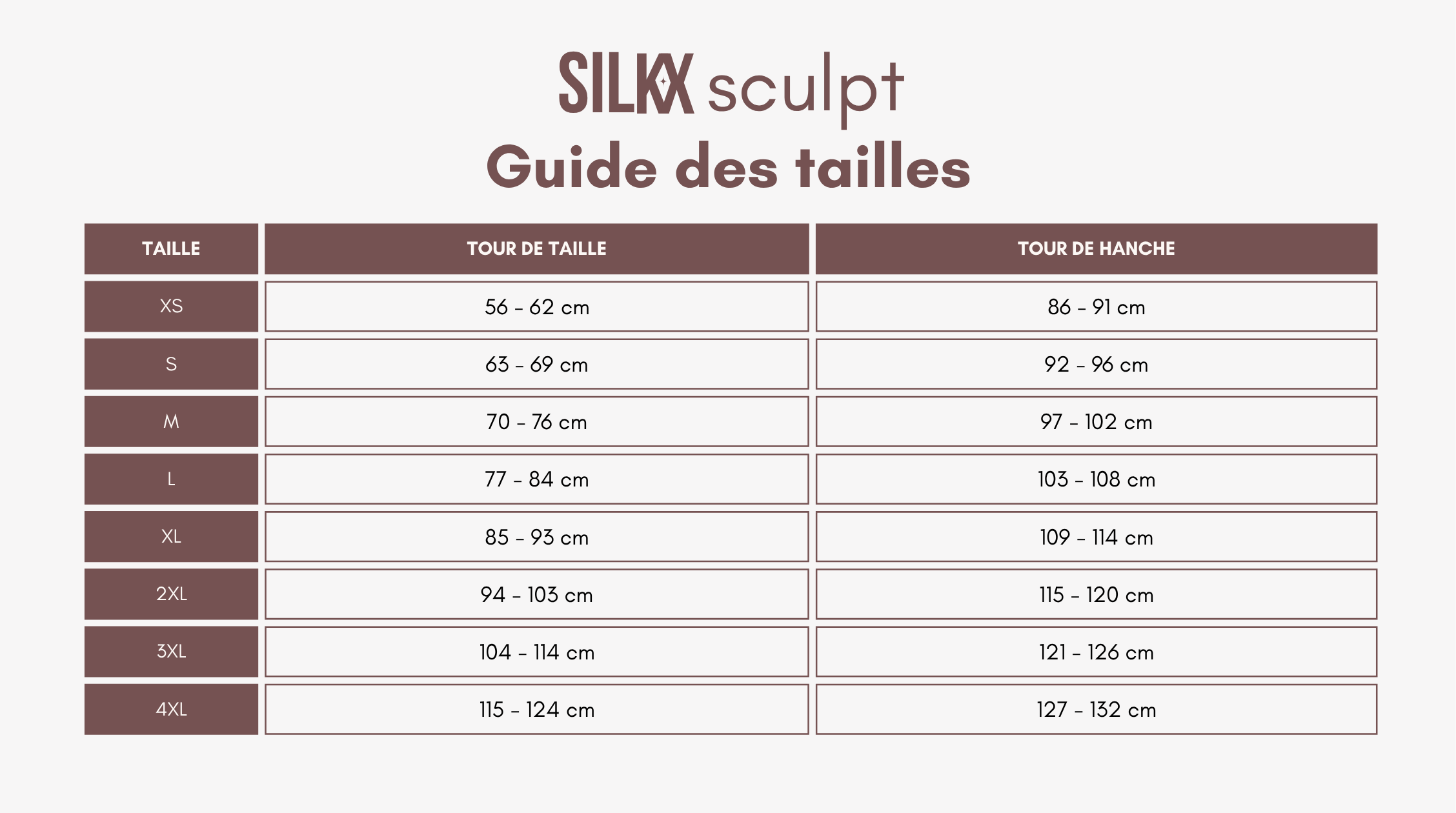 Parce que chaque corps est unique, SILKX a conçu un guide simple pour t’aider à trouver la gaine parfaite. Suis nos indications pour choisir ta taille en toute confiance : maintien, confort et silhouette harmonieuse - sans jamais te sentir comprimée !